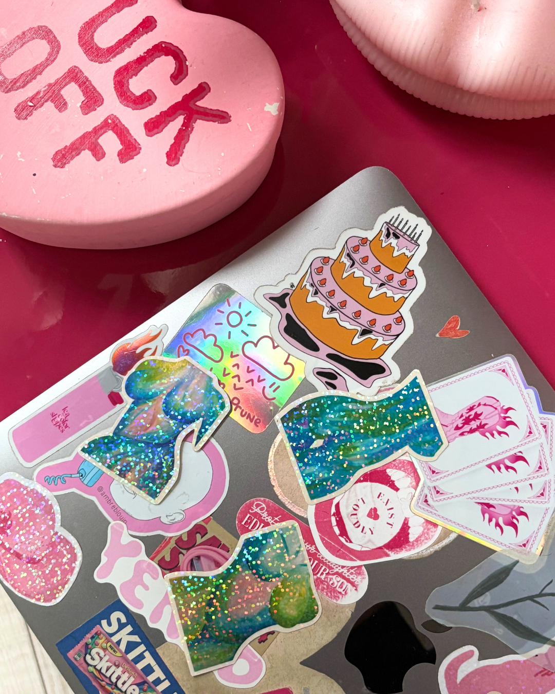 Ce lot comprend 5 stickers de 5 x 2,5 cm, réalisés à partir de la numérisation des toiles et sublimés d’une touche pailletée.